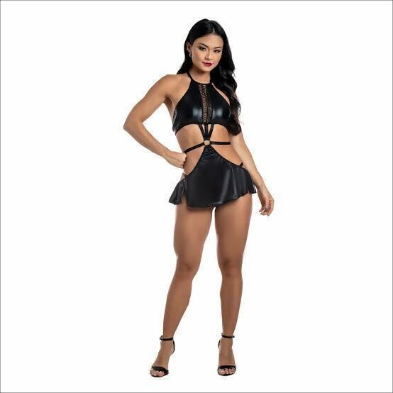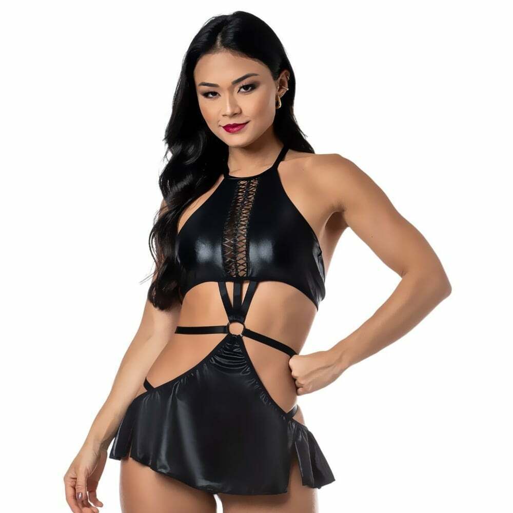 Fabricado em cirrê um material que lembra o couro, o conjunto é a escolha perfeita para destacar e valorizar suas curvas. O conjunto é composto por um vestido curto com detalhes de argolas de metal, recortes diferenciados e abertura na parte de trás, e uma calcinha fio dental do mesmo material do vestido com laterais médias e com regulagem. Desvende sua alma felina com o conjunto Gata Brava e vista-se para as aventuras de prazer! 😏